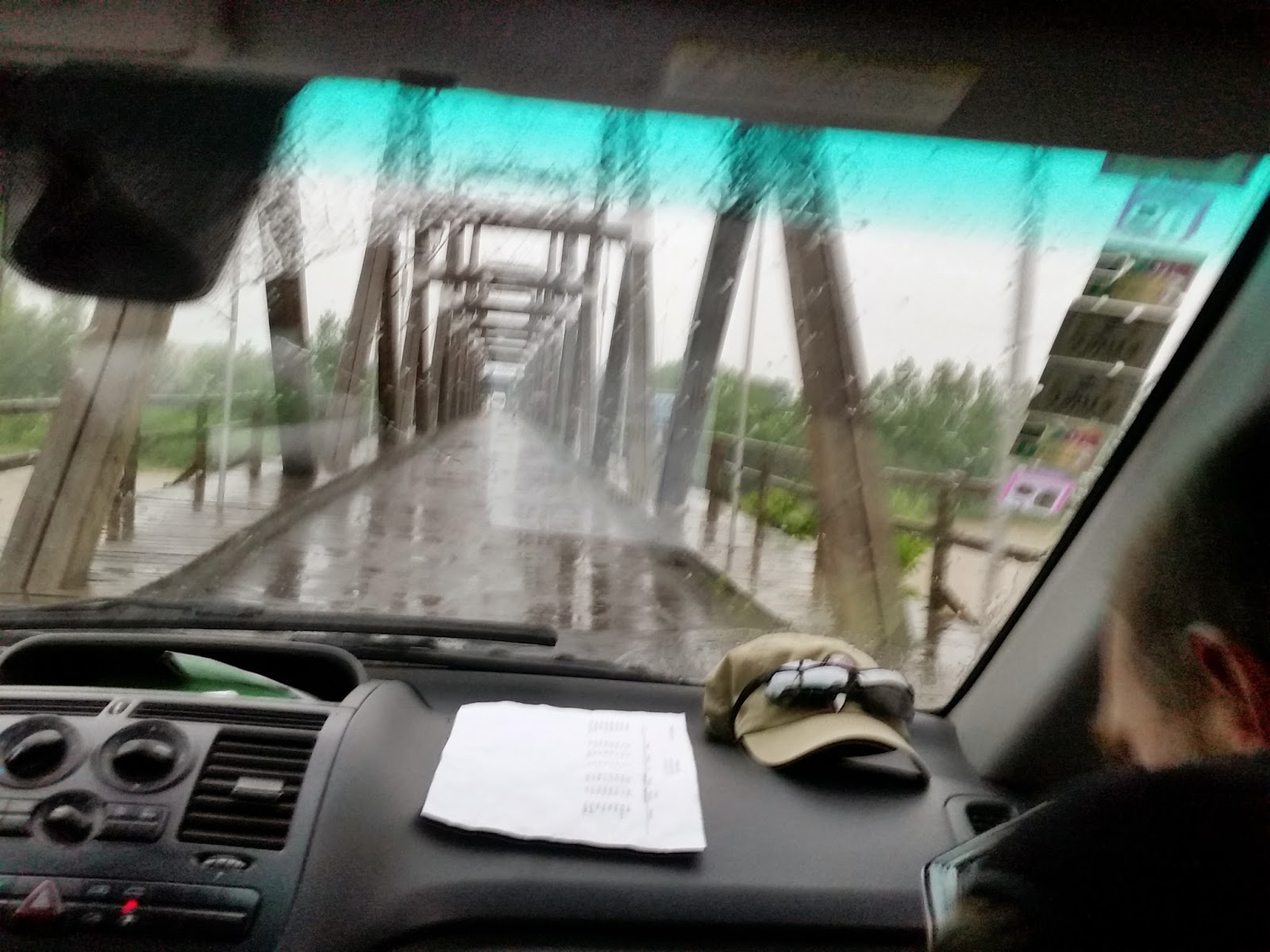 Plan had been to walk across Tisza River bridge from Ukraine into ROMANIA, but, as you can see, it is pouring rain!